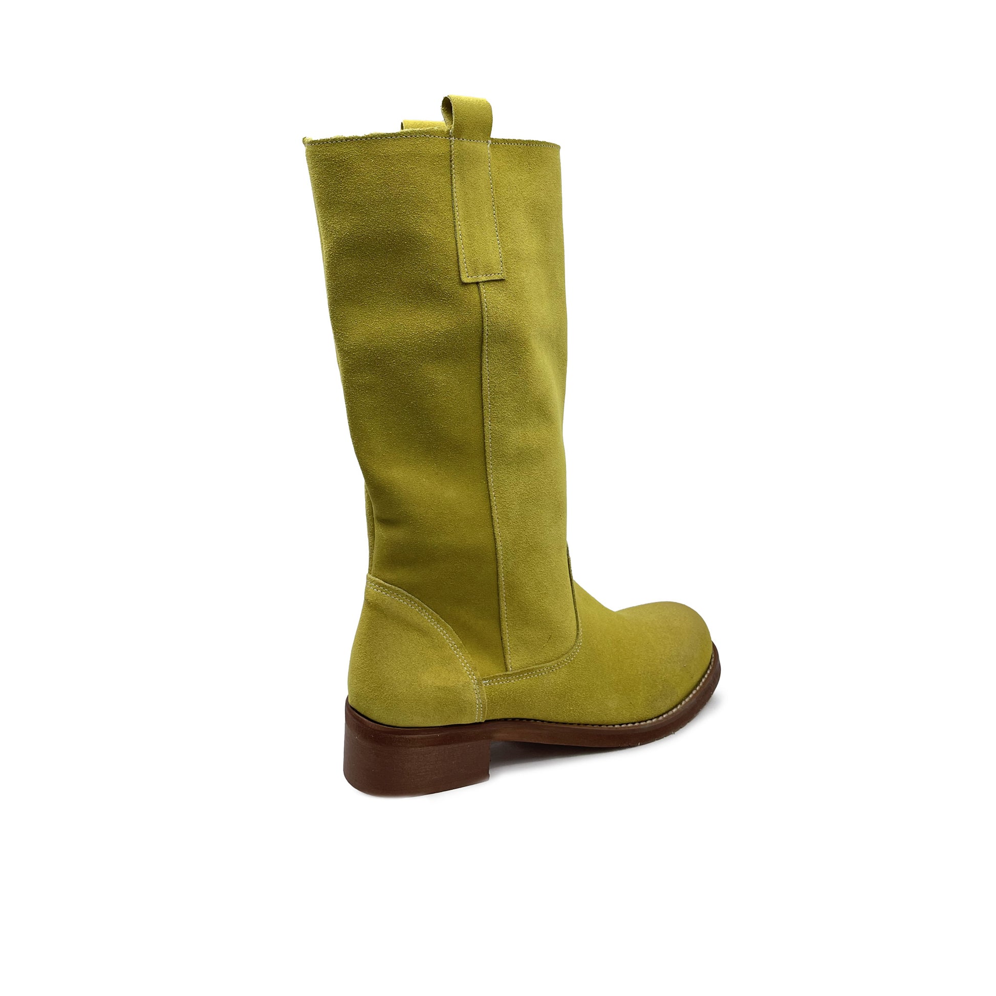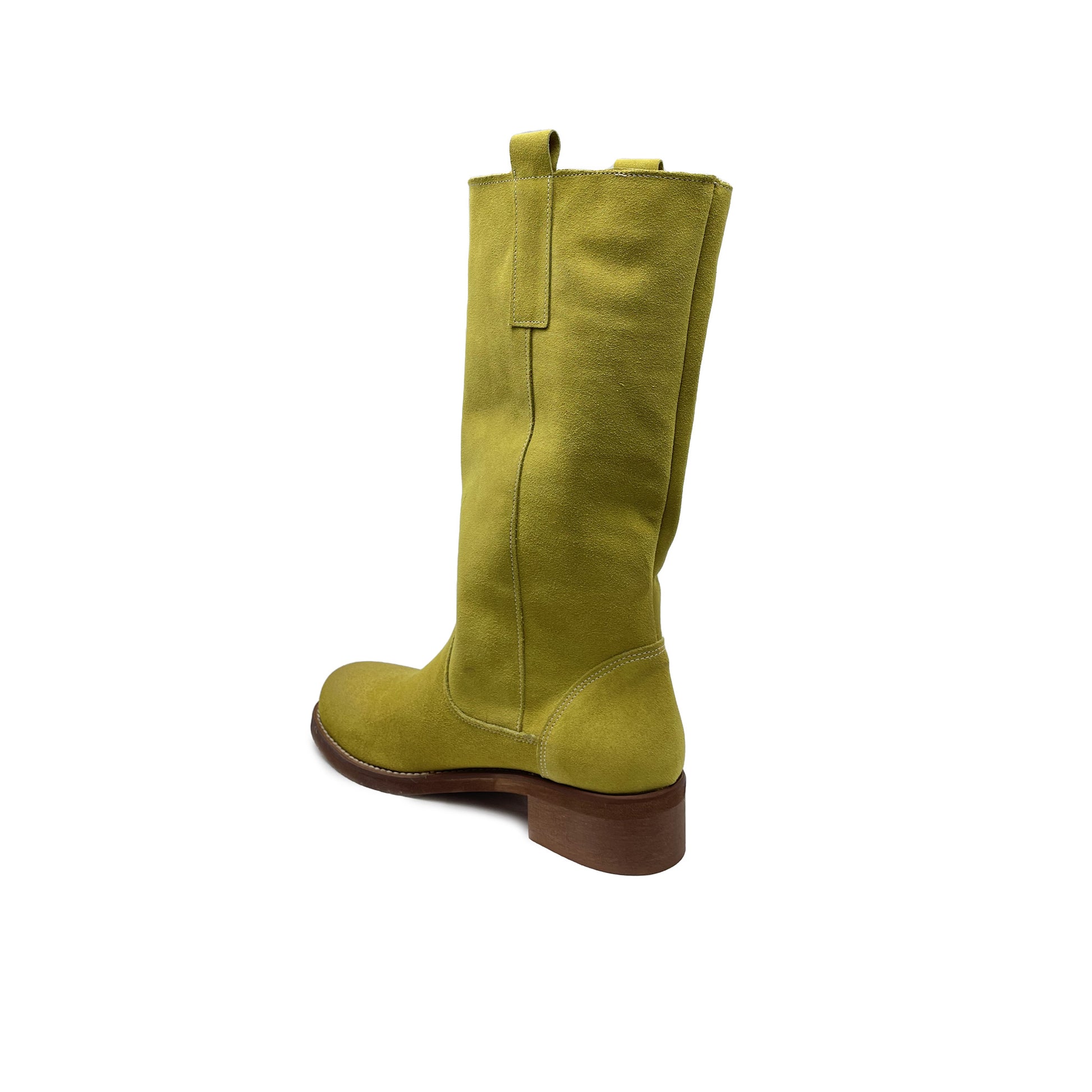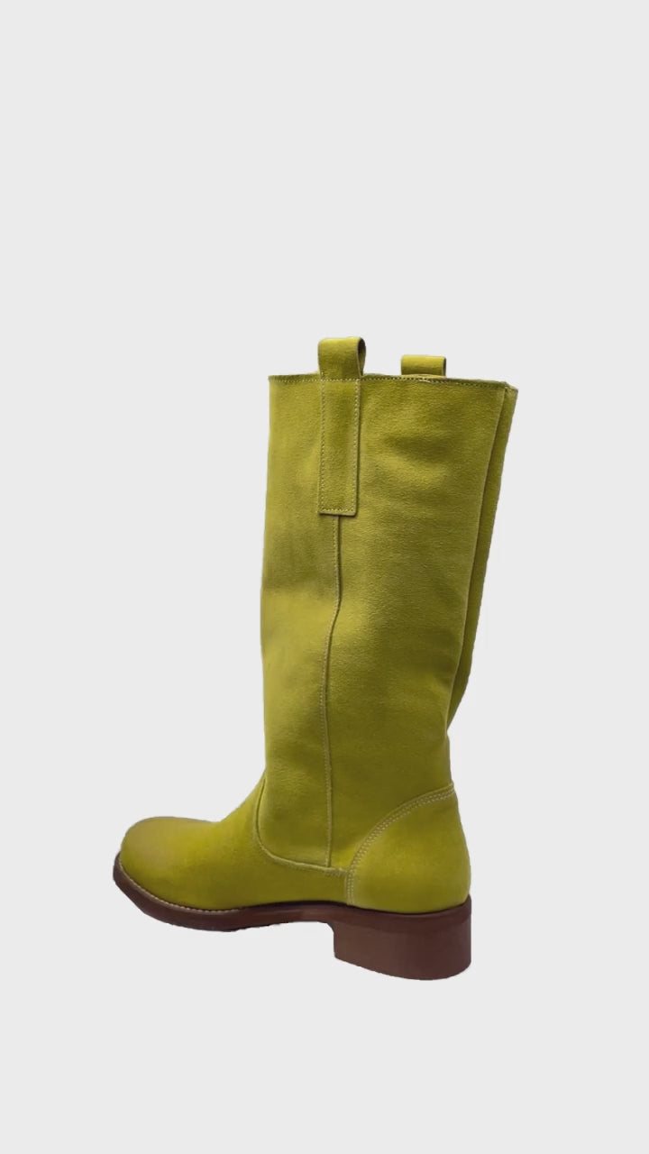 Esplora il tuo lato estivo con lo stivale PARMA in camoscio giallo. La forma a punta tonda e la pianta larga garantiscono comfort e stile per tutto il giorno. Esternamente sfoderato, è perfetto per l'estate. Disponibile in altezza polpaccio per un tocco di eleganza.