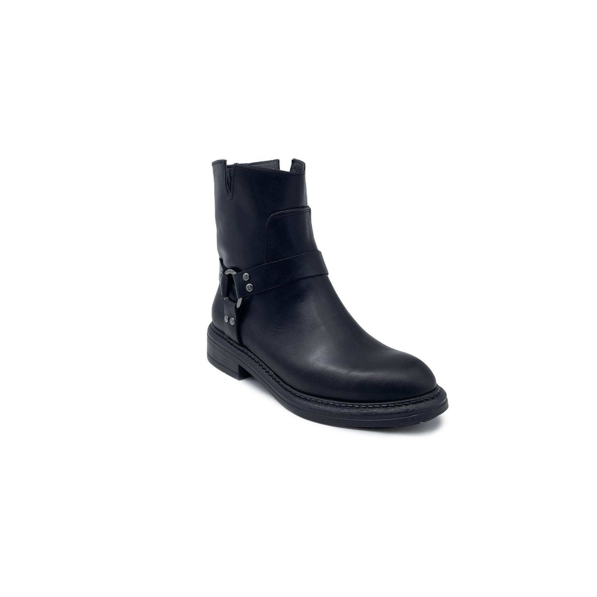 Explora el estilo refinado y distintivo con nuestro botín en piel auténtica negra, elaborado artesanalmente en Italia. El diseño con efecto curvado ofrece una silueta única que se adapta perfectamente a tu figura, haciendo que cada look sea más sofisticado. La tobillera fija con anillos en caña de fusil añade un toque de carácter audaz, perfecto para quienes les gusta destacarse.